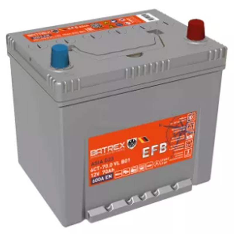 Главная / Каталог автомобильных товаров / Аккумуляторы / Автомобильные аккумуляторы / АКБ Batrex ASIA EFB 70 Ah 600 A 230х175х223 о.п. 4610082700352