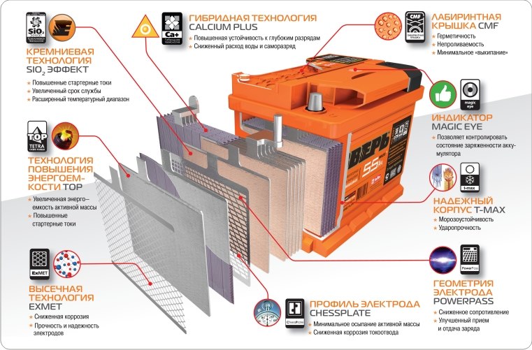 Специальные добавки в активную массу электродов оксида кремния (SIO2), позволяют выдавать ток, значительно превышающий требования установленных стандартов. Гибридная технология сочетает лучшие свойства малосурьмянистой и кальциевой технологий: кальциевый сплав в отрицательном электроде гарантирует высокую энергоемкость и низкий саморазряд, а малосурьмянистый сплав обладает устойчивостью к глубоким разрядам (особенно в зимнее время).