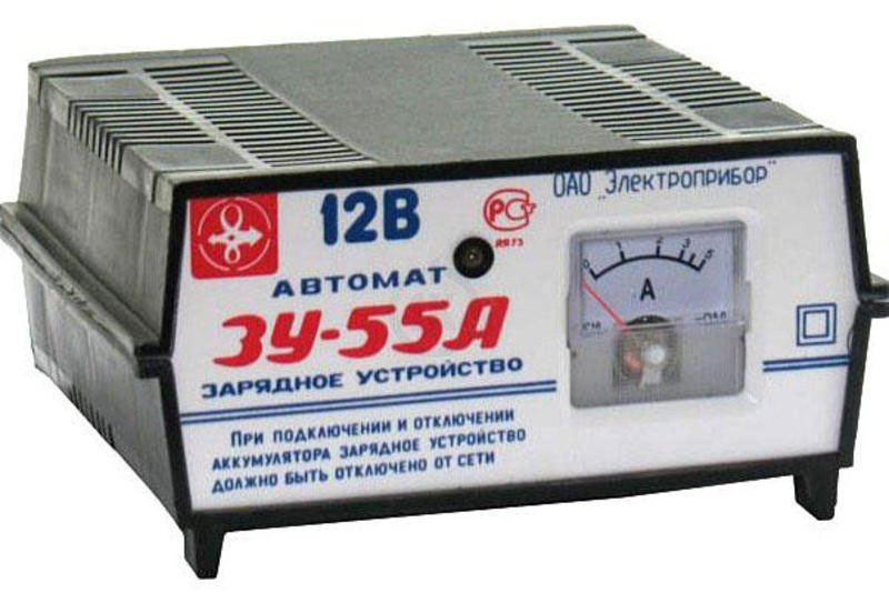 Зарядное устройство (трансформаторное) ЗУ-55А было разработано для зарядки автомобильных 12 В-аккумуляторов кислотного типа емкостью 40-60 А·ч. Прибор довольно компактный. Его габариты позволяют легко перемещать устройство от одного аккумулятора к другому. Вес данной модели составляет около 3 кг. Для питания зарядного устройства требуется электросеть с напряжение 220 В и частотой 50 Гц. Максимальная потребляемая мощность не превышает 80 Вт.