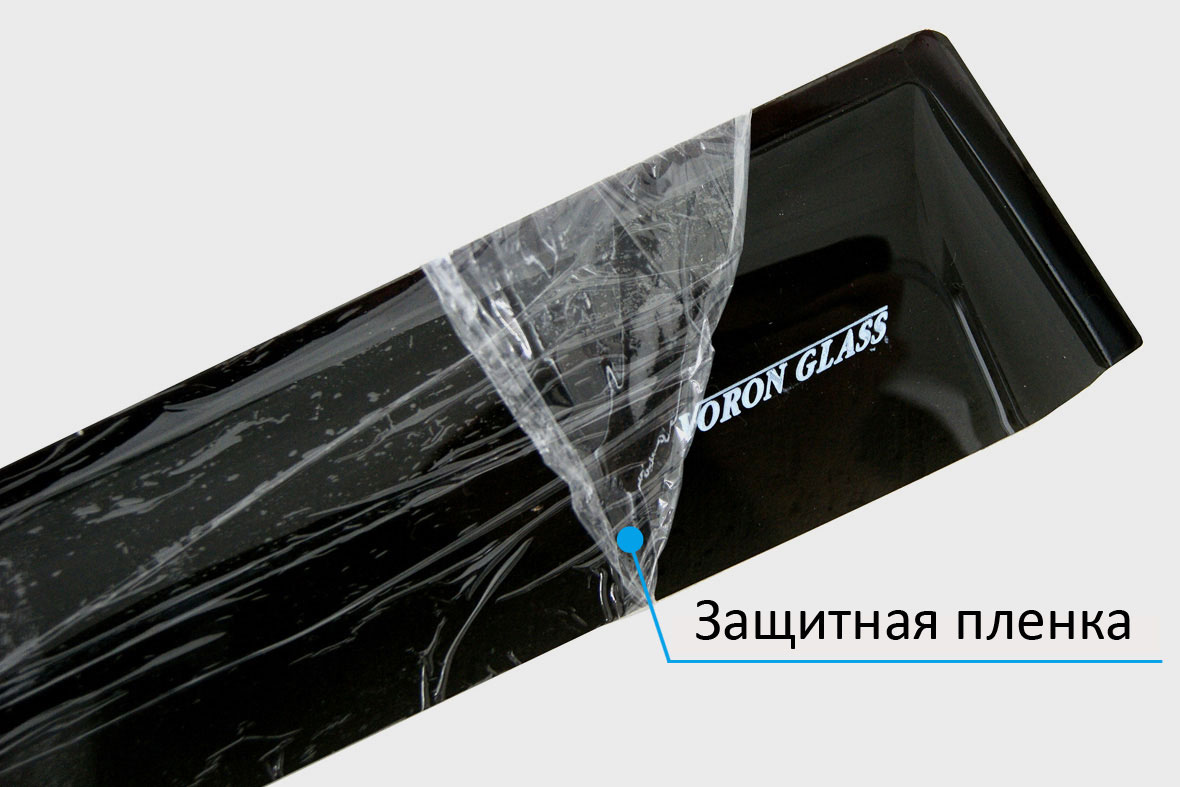 Дефлекторы выполнены из поликарбоната – гибкого и прочного материала. Устойчивы к механическому воздействию и ультрафиолету. Эксплуатация без сколов и трещин. Надежная фиксация, благодаря профессиональному скотчу 3М с высокой адгезией. Отсутствие шума при эксплуатации. Проверенная аэродинамическая форма дефлектора позволяет использовать его без посторонних звуков даже на высоких скоростях. Каждый дефлектор упакован в защитную пленку, гарантирующую отсутствие пыли и царапин