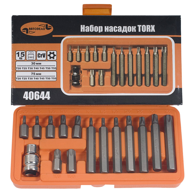 Главная / Каталог автомобильных товаров / Автоинструменты и оборудование / Головки, биты / Набор бит Автодело Torx 15 пр. Т20-55 L=30 мм/L=75 мм 40644