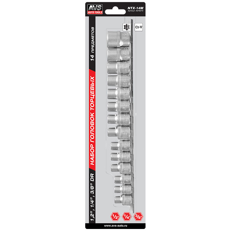 Технические характеристики товара «Набор головок AVS Torx 14 пр. 1/2" 1/4" 3/8" E4-E24 на держателе A07827S»