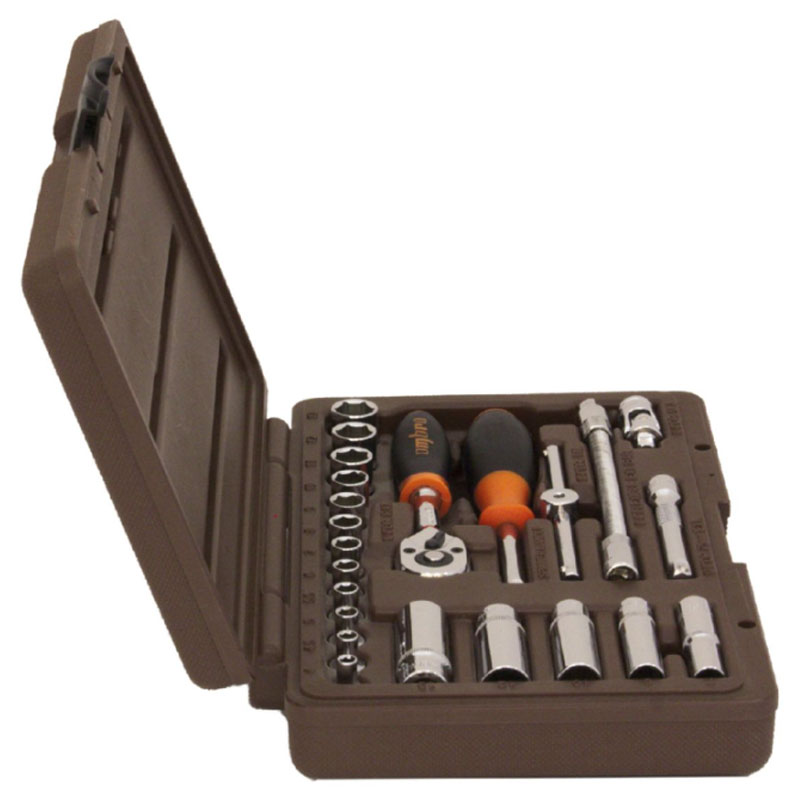 Головки торцевые 1/4 , 12 шт. :4,4.5,5,5.5,6,7,8,9,10,11,12,13 мм.. Головки торцевые глубокие 1/4 , 5 шт. 7, 8, 10, 12, 13 мм. Трещоточная рукоятка 1/4 Удлинитель 1/4 , 75 мм. Гибкий удлинитель 1/4 , 150 мм. Отверточная рукоятка 1/4 Шарнир карданный 1/4 Вороток Т-образный 1/4 Пластиковый кейс Цветная упаковка
