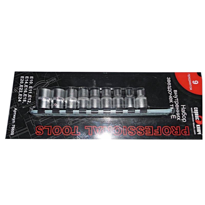 Набор головок внутренних звездочек головок типа Е, 9 предметов. Упаковано в блистер на металлической подложке-держателе. Описание: 1/2 (Е10, Е11, Е12, Е14, Е16, Е18, Е20, Е22, Е24). Изготовлен из высококачественной стали 50bv30.