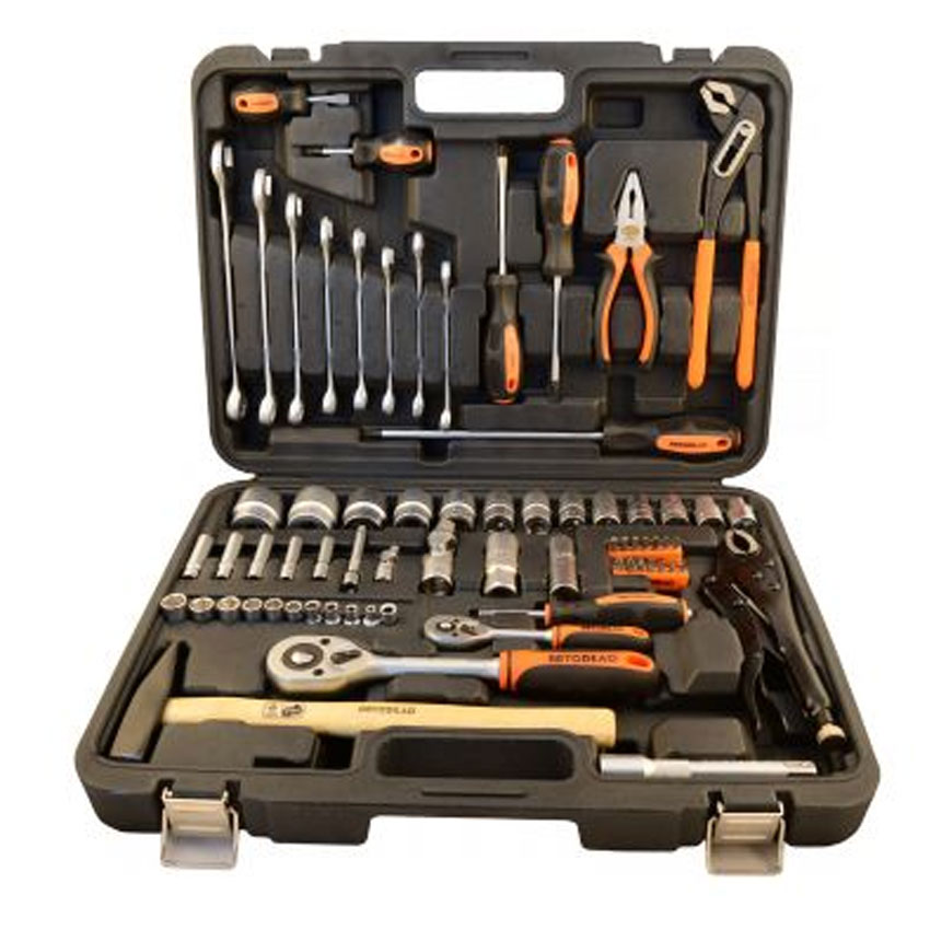 Комплектация набора оптимизирована для использования в автомобиле. Набор укомплектован торцевыми головками и ключами с присоединительными квадратами 1/4" и 1/2". Торцевые головки с шестигранным рабочим профилем. Изготовлены методом холодной штамповки из инструментальной стали CrV. Инструмент закален до твердости не менее 39 HRC. Применено хромовое защитно-дакоративное покрытие с эффектом матовой поверхности. Набор упакован в пластиковый чемодан.