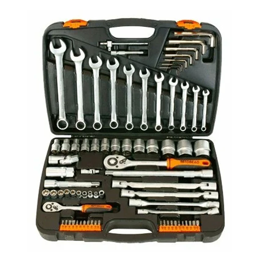Комплектация набора оптимизирована для использования в автомобиле. Набор укомплектован торцевыми головками и ключами с присоединительными квадратами 1/4" и 1/2". Торцевые головки с шестигранным рабочим профилем. Изготовлены методом холодной штамповки. Инструмент закален до твердости не менее 39 HRC. Применено хромовое защитно-дакоративное покрытие с эффектом матовой поверхности. Набор упакован в пластиковый чемодан.