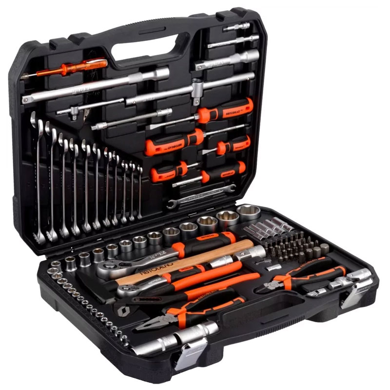Комплектация набора профессионального инструмента оптимизирована для использования в автомобиле. Пожизненная гарантия (до полного физического износа). Торцевые головки изготовлены методом холодной штамповки. Профиль рабочей части Super Lock для более надежного захвата крепежа, особенно деформированного. В комплектации набора использованы комбинированные ключи повышенной точности, изготовленные методом холодной штамповки. Инструмент закален до твердости не менее 39 HRC. Применено хромовое защитно-декоративное покрытие с эффектом матовой поверхности. Набор упакован в двухцветный пластиковый чемодан с металлическими замками. Петли чемодана с металлическими осями.