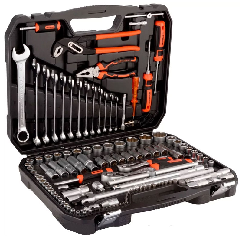 Комплектация набора профессионального инструмента оптимизирована для использования в автомобиле. Пожизненная гарантия (до полного физического износа). Торцевые головки изготовлены методом холодной штамповки. Профиль рабочей части Super Lock для более надежного захвата крепежа, особенно деформированного. В комплектации набора использованы комбинированные ключи повышенной точности, изготовленные методом холодной штамповки. Инструмент закален до твердости не менее 39 HRC. Применено хромовое защитно-декоративное покрытие с эффектом матовой поверхности. Набор упакован в двухцветный пластиковый чемодан с металлическими замками. Петли чемодана с металлическими осями.
