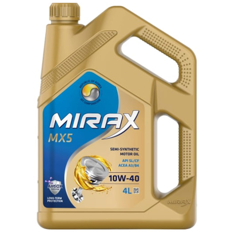 Полусинтетическое моторное масло - MIRAX MX5 SAE 10W-40 API SL/CF, ACEA A3/B4 - предназначено для бензиновых и дизельных двигателей легковых автомобилей, малотоннажных грузовиков и микроавтобусов. Многофункциональный пакет присадок в совокупности с высококачественным базовым маслом обеспечивает эффективную эксплуатацию двигателя. Благодаря синтетическим компонентам обладает высокой устойчивостью к окислению и пониженной испаряемостью, защищает двигатель от образования шлама и высокотемпературных отложений. Разработано с учетом требований корейских и китайских автопроизводителей