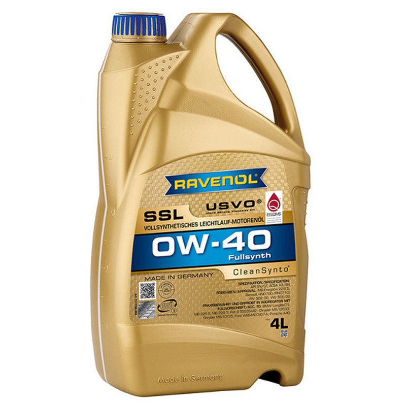 Полностью синтетическое ПАО масло RAVENOL SSL 0W-40 для легковых автомобилей Audi, BMW, Chrysler, Fiat, Mercedes-Benz, Porsche, Renault, Skoda, VW и других, требующих применения моторных масел с вязкостью SAE 0W-40 уровня качества ACEA A3/B4 с высоким щелочным числом, и эксплуатируются в условиях экстремально низких температур.