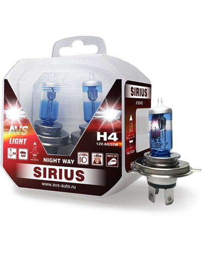 Главная / Каталог автомобильных товаров / Автосвет / Галогеновые лампы / Лампа галогенная 12В H4 60/55Вт 110% 2 шт. Sirius Night Way AVS (A78949S)