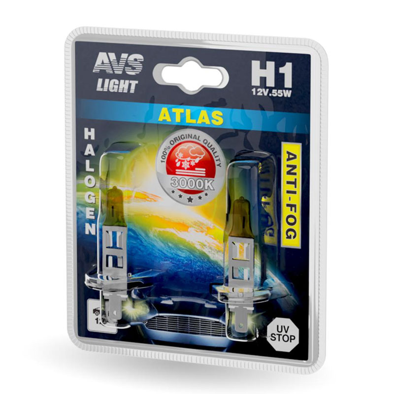Технические характеристики товара «Лампа галогенная AVS всепогодная Atlas Anti-Fog 12В H1 55Вт дальнего света блистер 2шт. A78618S»