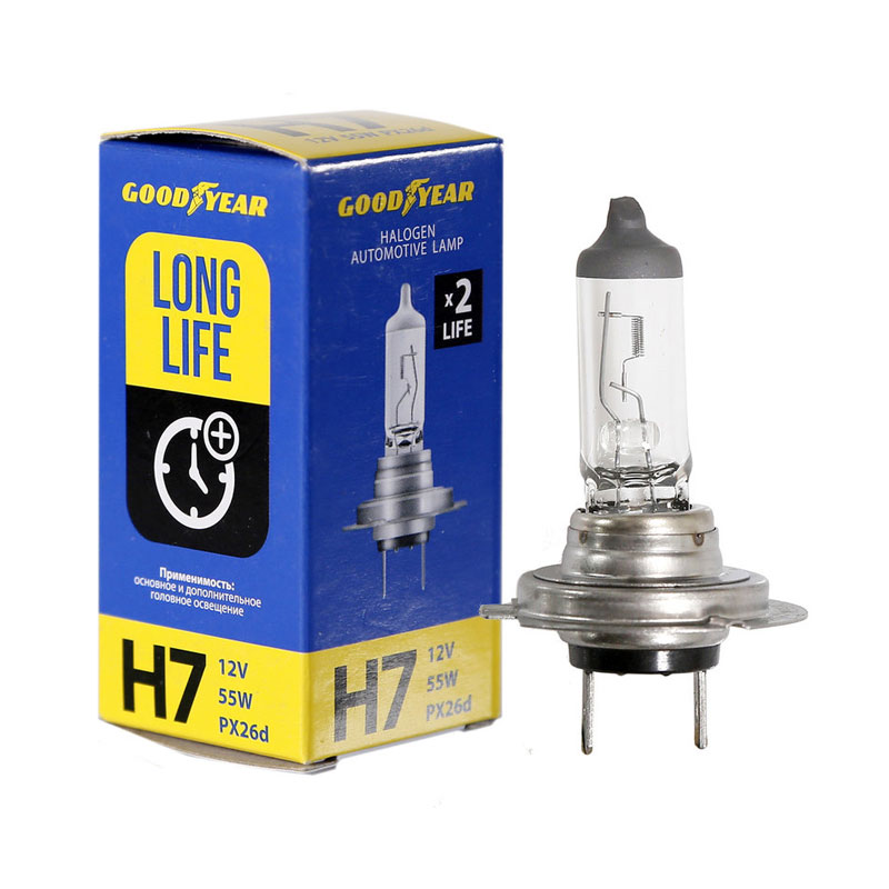 Главная / Каталог автомобильных товаров / Автосвет / Галогеновые лампы / Лампа галогенная Goodyear Long Life 12В H7 55Вт GY017122