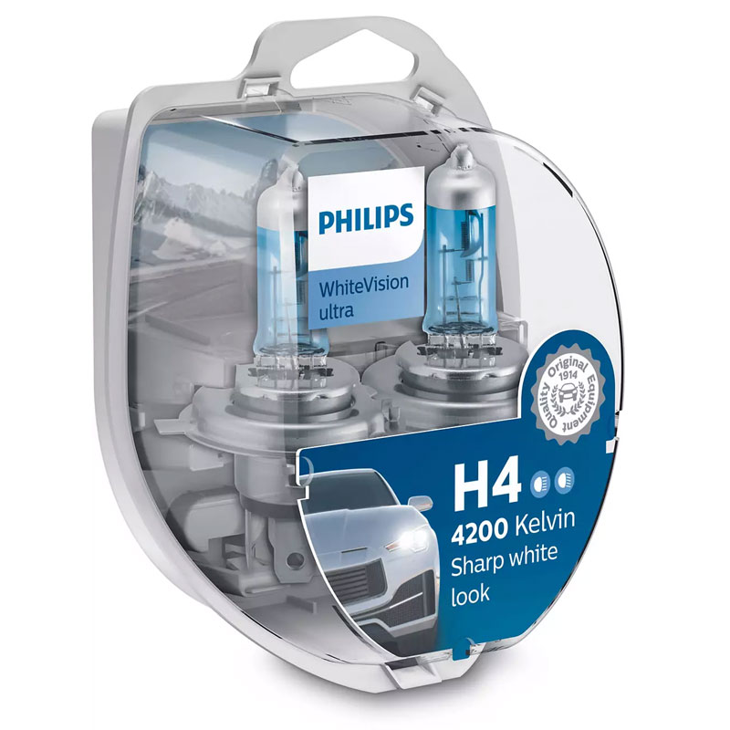 Автомобильные лампы Philips WhiteVision Ultra H4 со специальным покрытием и цветовой температурой 4200 К гарантируют превосходное освещение в любых условиях. Это самые яркие галогенные лампы с белым светом для дорог общей сети в нашем ассортименте. Кроме того, они придают автомобилю стильный внешний вид.