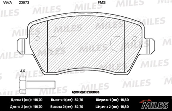 Технические характеристики товара «Тормозные колодки передние MILES E100108»
