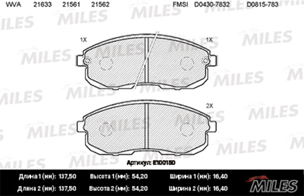 Технические характеристики товара «Тормозные колодки передние MILES E100150»