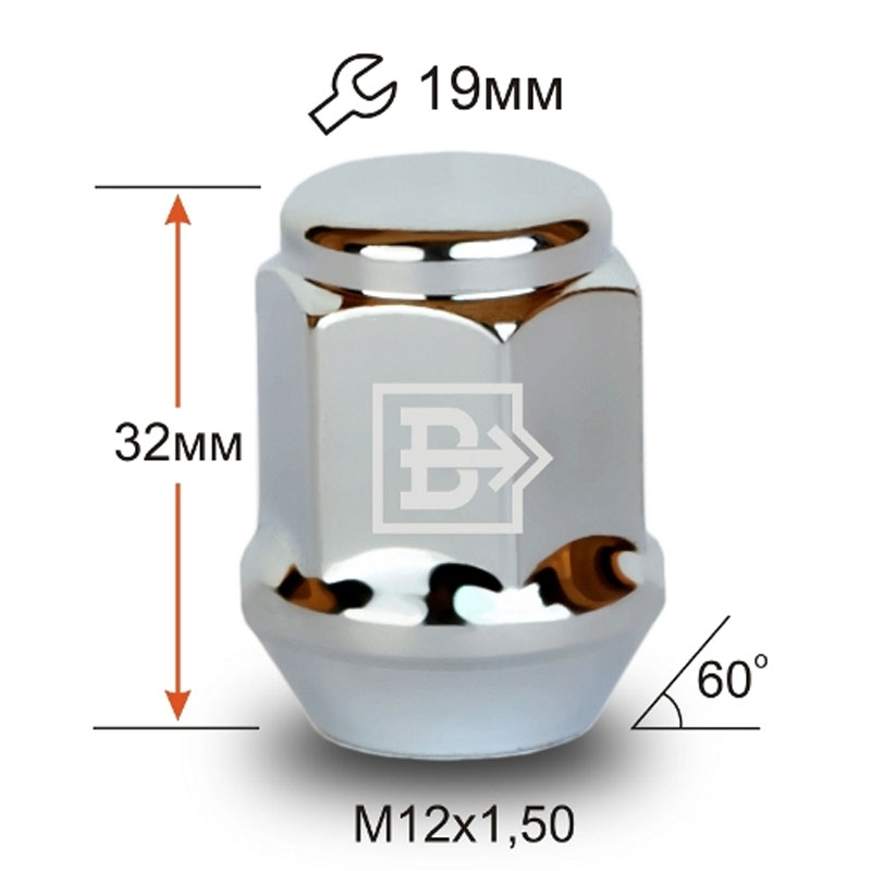 Технические характеристики товара «Гайка М12*1,5*32 конус, хром, кл. 19мм 801345Cr»