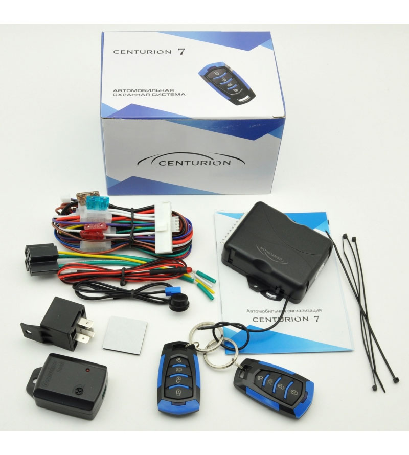 Centurion 7 комплектуется двумя брелоками без обратной связи с оригинальным дизайном. Он имеет прочную окантовку синего цвета и четыре клавиши управления. Помимо этого, у него компактные размеры и стильный корпус. В данном брелоке используется стандартная для таких систем динамическая кодировка сигнала, когда код меняется каждый раз при нажатии кнопки.