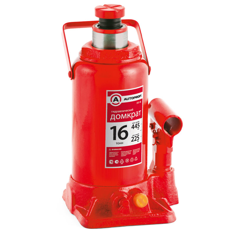 Автомобильный гидравлический домкрат с рабочей высотой до 445 мм. В сложенном состоянии занимает всего 225 мм по высоте. Максимальный груз — 16 тонн. Перепускной клапан допускает перегрузку на 25%, но препятствует использованию домкрата при недопустимой нагрузке. Бутылочный домкрат предназначен для работы на твердой и ровной поверхности. После подъема груза он должен быть зафиксирован на страховочных опорах (продаются отдельно).