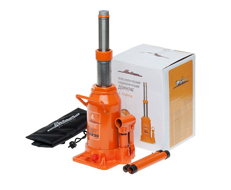 Домкрат данной модели работает на основе стандартной схемы функционирования бутылочного домкрата. Отличительной особенностью изделия является наличие телескопического механизма, который позволяет увеличить расстояние, на которое возможно поднять груз. Данное преимущество способно помочь при проведении строительных работ и значительно ускорить ремонтный процесс. Гарантия — 1 год.
