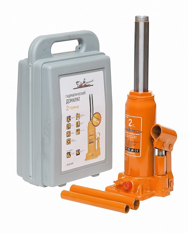 Бутылочный домкрат осуществляет свое функционирование на основе механизма с гидравлическим строением. Именно поэтому эксплуатация бутылочного домкрата не требует масштабных физических и временных затрат. Данная модель домкрата подойдет для ремонта мелкой и среднегабаритной техники. Для хранения устройства предусмотрен пластиковый кейс с ручкой.