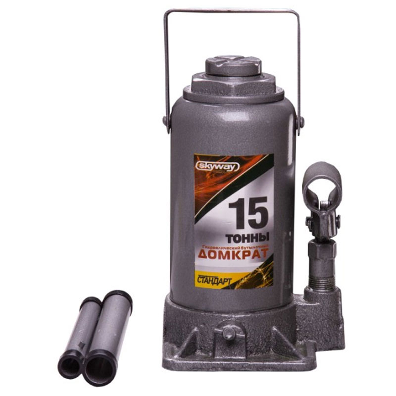 Домкрат гидравлический бутылочный 15т h 210-395мм SKYWAY STANDART - необходимость заменить колесо может возникнуть в любую минуту, справиться с такой задачей и при этом затратить минимум собственных сил, поможет компактный и надежный гидравлический бутылочный домкрат SKYWAY. При небольших габаритах, он может поднять не только легковой автомобиль, но также грузовой транспорт 15т. Домкраты серии STANDART сочетают в себе простую и надежную конструкцию. Корпус и детали полностью металлические, что обеспечивает длительный срок безотказной службы по доступной цене.