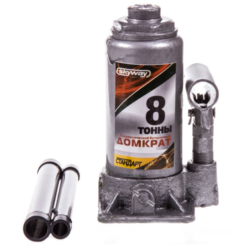 Домкрат гидравлический бутылочный 8т h 185-370мм SKYWAY STANDART - необходимость заменить колесо может возникнуть в любую минуту, справиться с такой задачей и при этом затратить минимум собственных сил, поможет компактный и надежный гидравлический бутылочный домкрат SKYWAY. При небольших габаритах, он может поднять не только легковой автомобиль, но также и небольшой грузовой транспорт. Домкраты серии STANDART сочетают в себе простую и надежную конструкцию. Корпус и детали полностью металлические, что обеспечивает длительный срок безотказной службы по доступной цене.