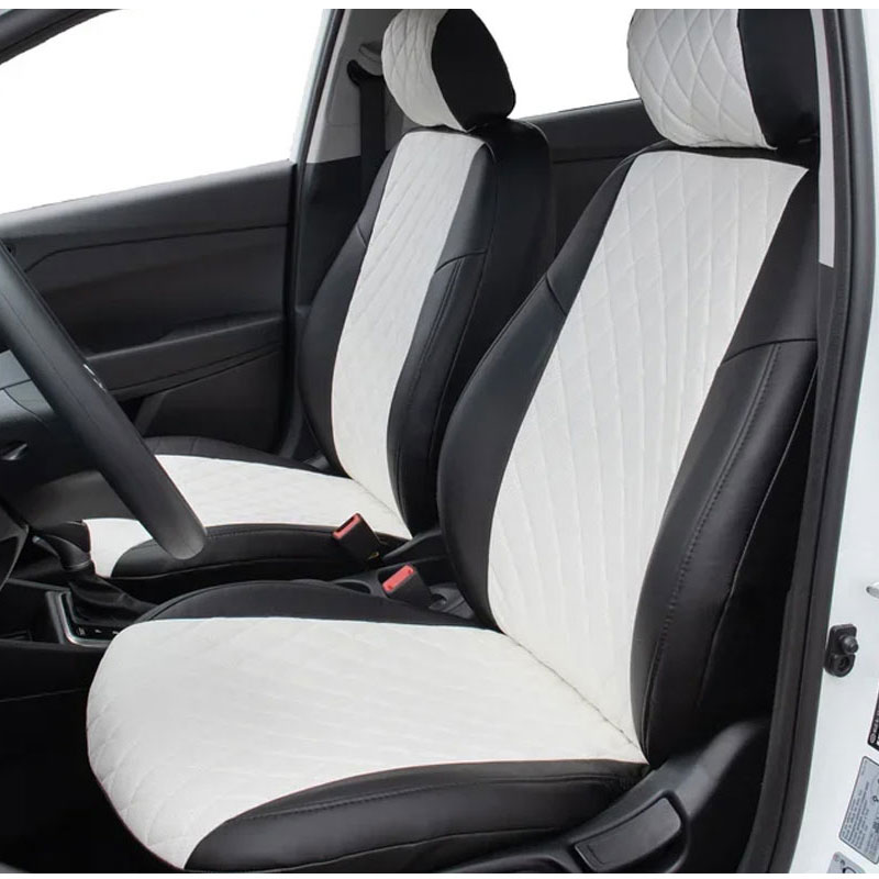 Авточехлы шьются из сверхпрочной и плотной экокожи «Аригон» на хлопковой основе. Внешне материал практически не отличается от натуральной кожи, принципиальная разница заключается в его повышенной износостойкости. Чехлы из экокожи с рисунком ромб пропускают воздух и превосходно отталкивают влагу, препятствуют появлению пятен и загрязнений. Центральная часть чехлов создается из перфорированной экокожи, тыльная и боковые стороны – из гладкой. Выполнение вставки с рисунком возможно в двух цветовых решениях – черном и сером.