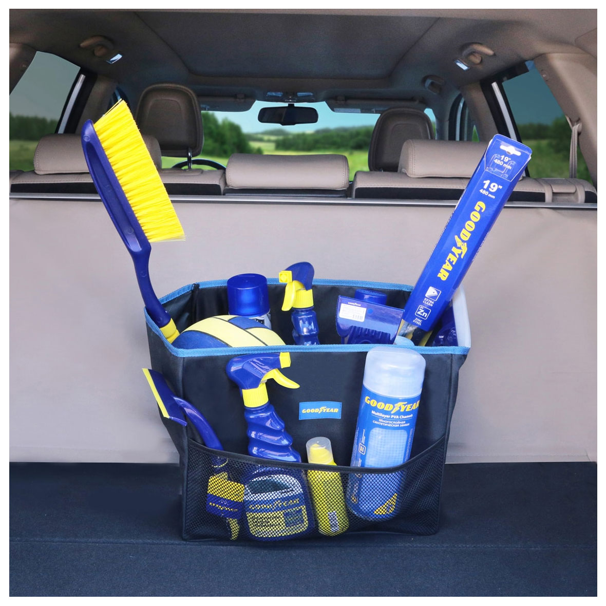 Главная / Каталог автомобильных товаров / Внутрисалонные аксессуары / Органайзеры для авто / Органайзер багажника Goodyear GY001001 складной 1 секция