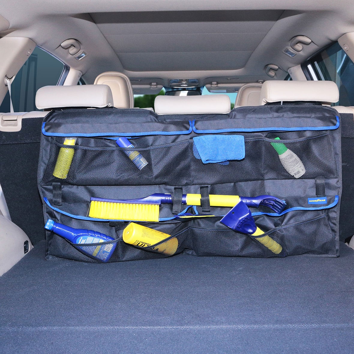 Главная / Каталог автомобильных товаров / Внутрисалонные аксессуары / Органайзеры для авто / Органайзер багажника Goodyear GY001006 подвесной для внедорожника