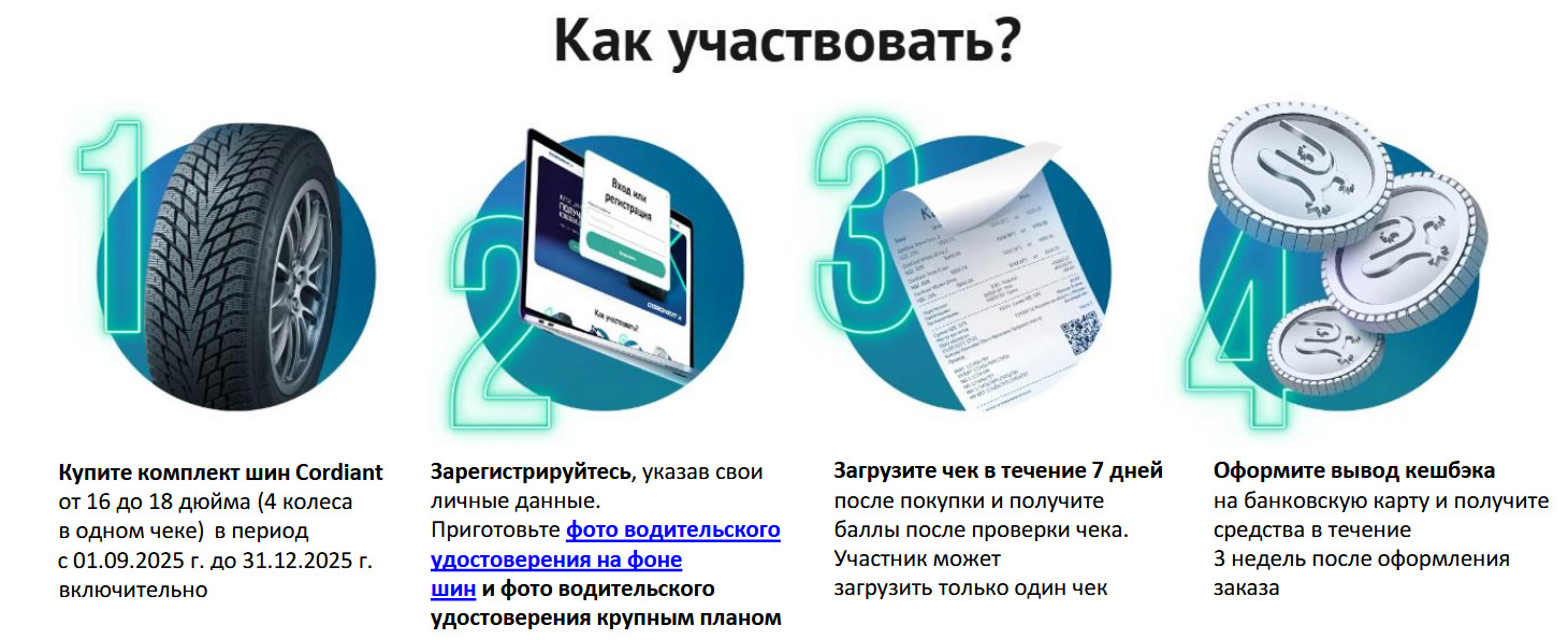 01 сентября 2025 года запустилась акция Cashback за покупку шин Cordiant.